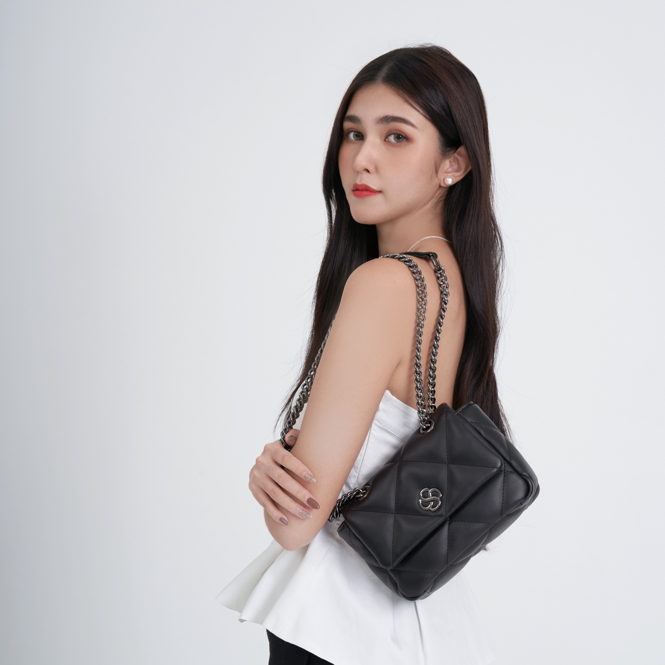 如果你偏好「更俐落、更精緻」的約會感,小款小方包會更顯比例。菱格紋理在鏡頭下立體感很加分,雙鏈條背法也方便你依外套厚度調整長度。