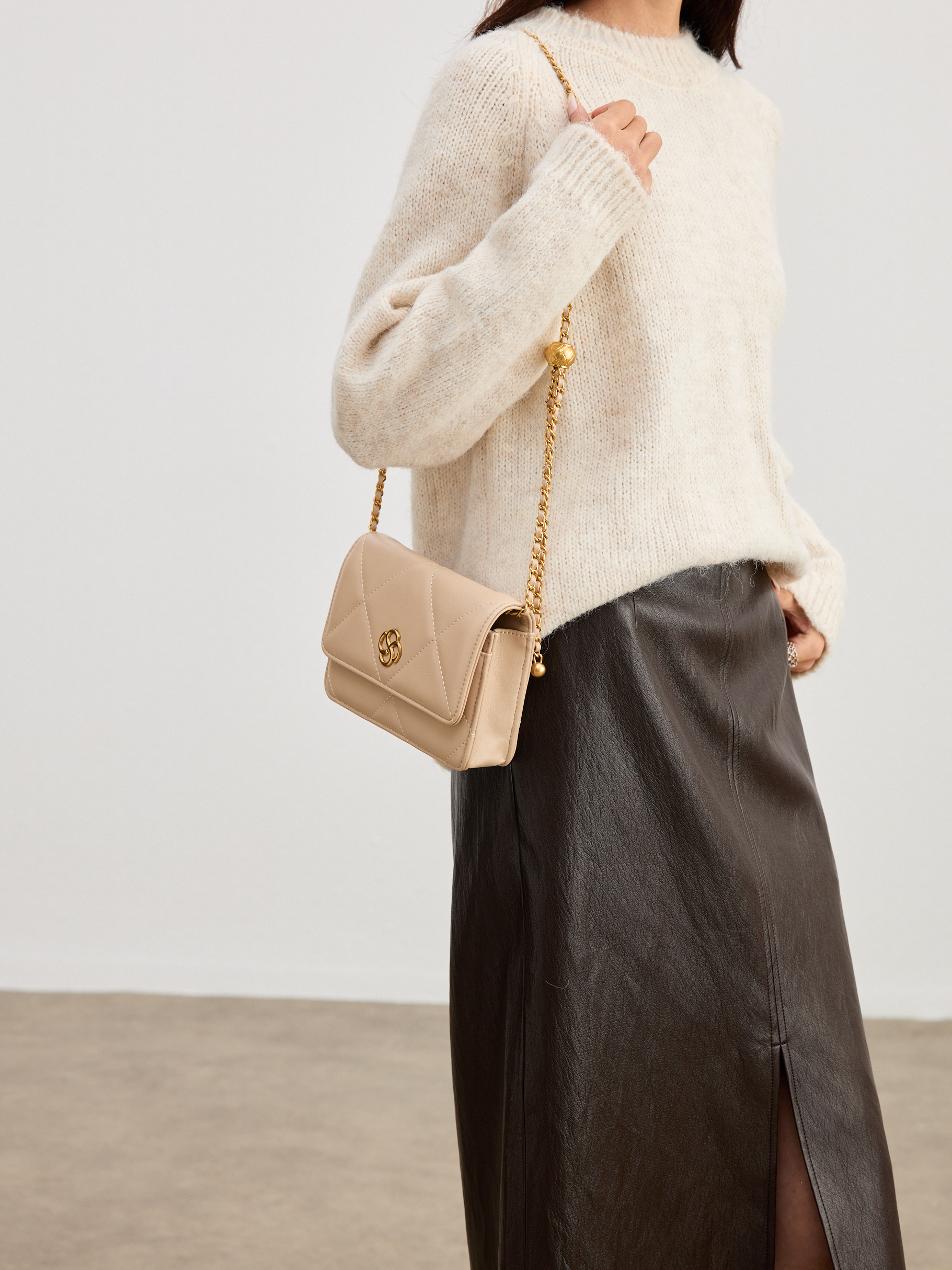 這款的設計感核心是「金球元素」:它不是單純的裝飾,而是把包包的視覺重點拉到更精緻的位置,讓整體更像飾品。當你穿搭比較簡單(素色外套、針織、基本丹寧)時,金球+鏈條會替你把完成度拉起來,屬於「不需要多想就很有質感」的斜背包。
